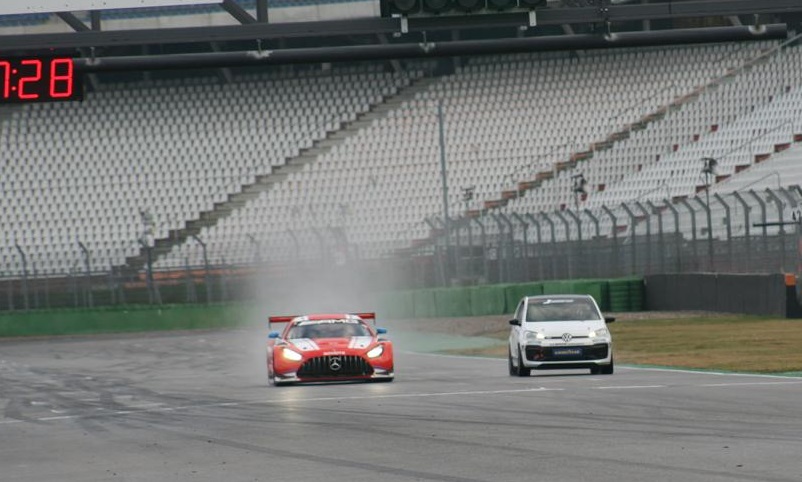 Am 12.11. hatte ich meinen Testtag zum VW-UP Junior Cup auf dem legendären Hockenheimring. In 3 Sessions konnte ich mich sowohl mit der Strecke als auch mit dem Auto vertraut machen. Vorab gab es eine Theoriestunde mit dem Teamchef Mirco Lubner. Nachdem alles erklärt war, durfte ich mich startklar machen und gegen 10.45 starte meine erste Session bei noch trockenem Wetter. Nach der 1. Session konnte ich schon sagen,  dass der VW up GTI für so ein unscheinbar kleines Auto ordentlich Leistung unter der Haube hat.